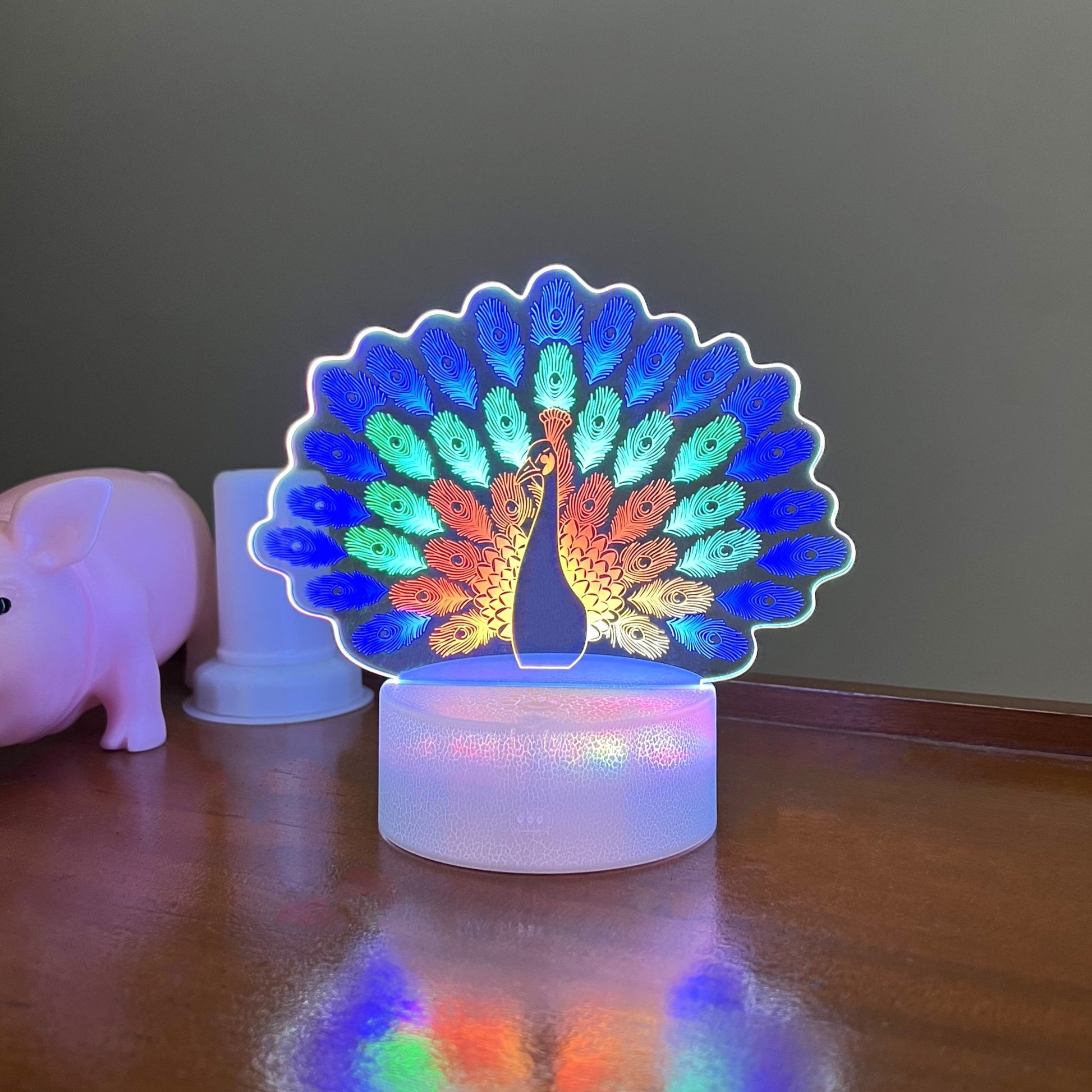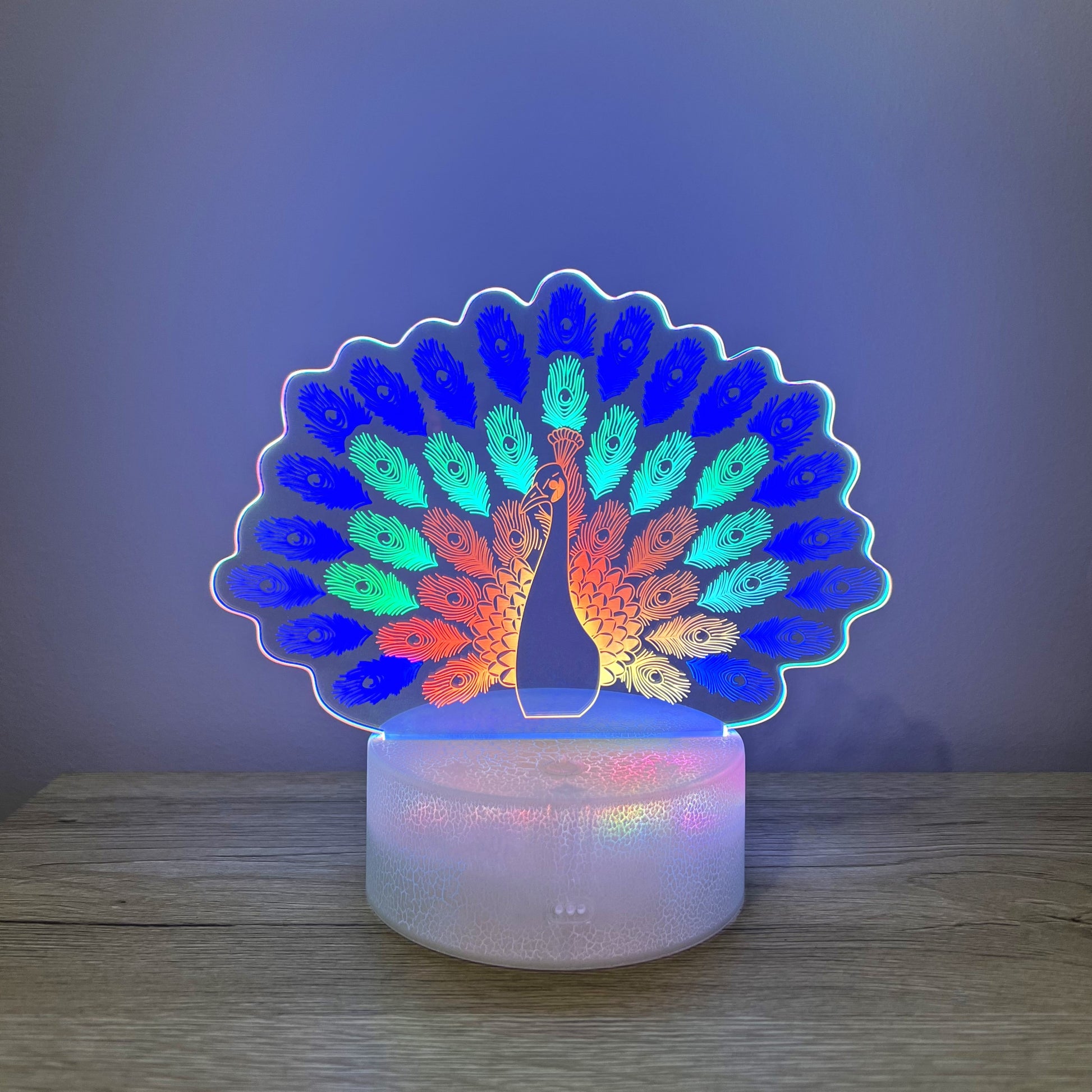Featuring a 3D peacock shape lit up by vibrant LED light, this lamp will be sure to capture the attention of anyone who enters the room.